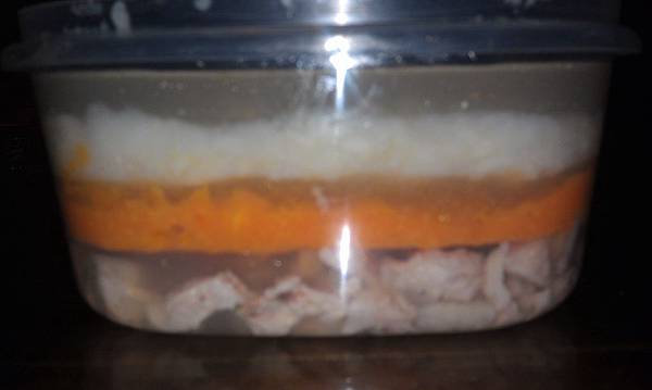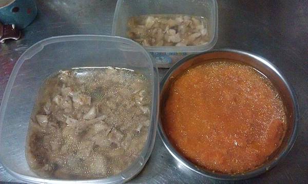 第三層:第二層略有成凍就可以放入白色蘿蔔及馬鈴薯泥再加入洋菜湯略高於食材