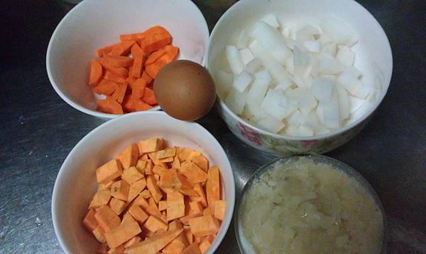 步驟1:先把所有食材 按照 顏色倒在一起蒸熟 然後用果汁機打成泥