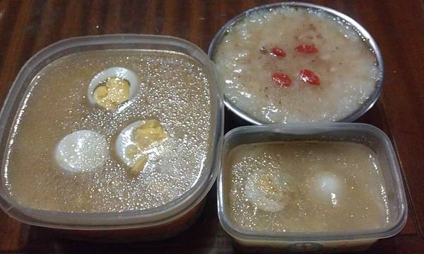 第一層:放入雞腿肉然後加入洋菜湯略高於食材放涼