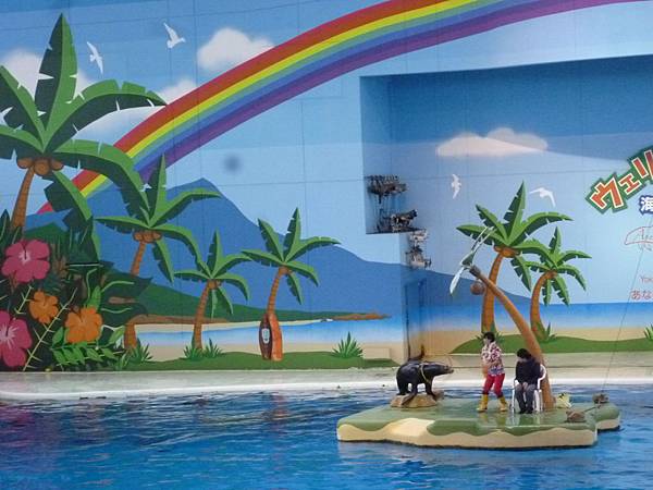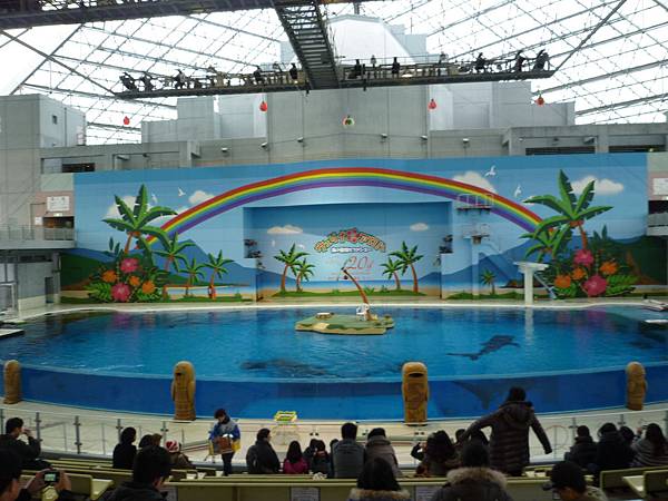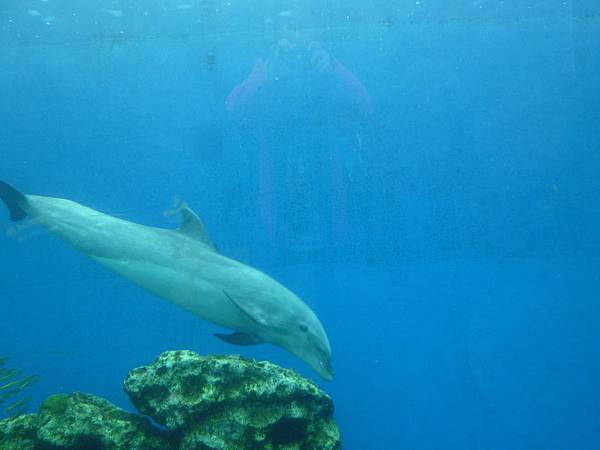裡面有跟屏東海生館一樣的海底隧道喔~~看到海豚很enjoy在水中游來游去