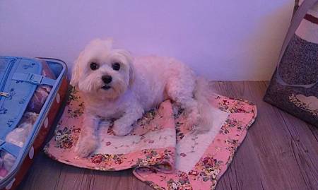 RUBY就睡在我帶來的墊子地上 晚上後來就跑到我的打開的行李箱 和我的衣服一起睡覺