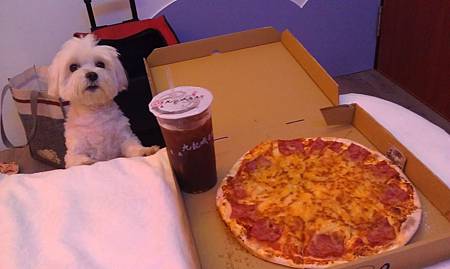 RUBY也一直想吃pizza 不過我還是我節制讓牠 吃一點點pizza 不過怎麼覺得 這次旅行回來