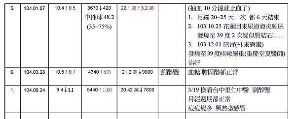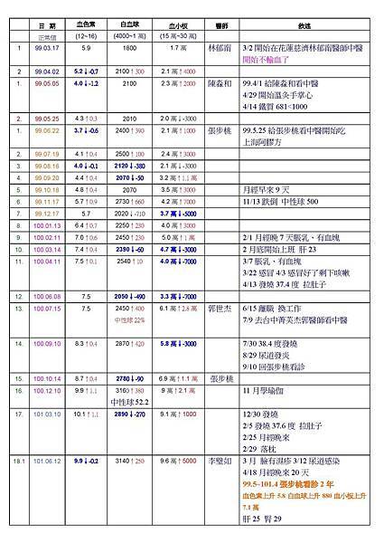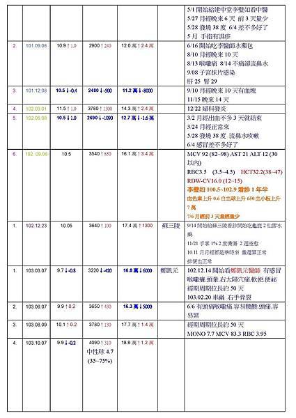 血色素10.1~10.5 進步0.4 白血球2890~3540進步650 血小板9萬~15.1萬進步6.1萬